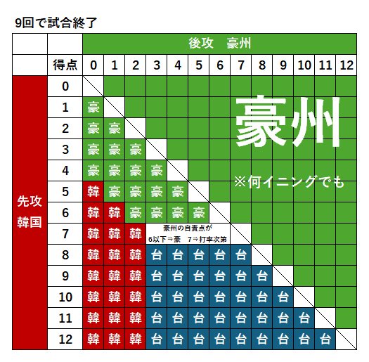 韓国はオーストラリアに5点差以上で勝利しないといけないけど、8点以上とると台湾に有利になってしまうから7点内で5点差つけてオーストラリアに勝たないといけないって感じかね?