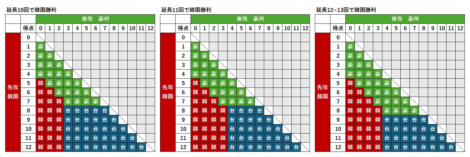 ◯3失点以上でも延長で一挙5点取れば、韓国進出の可能性